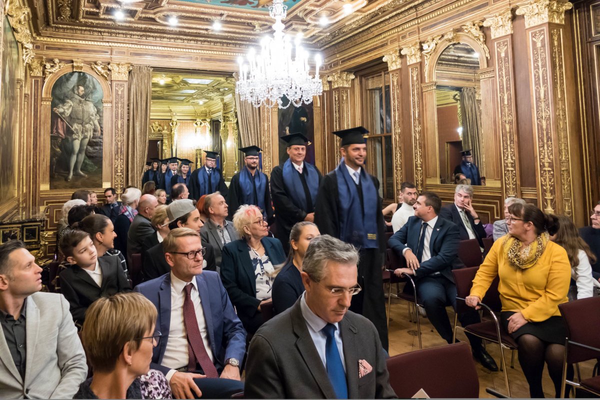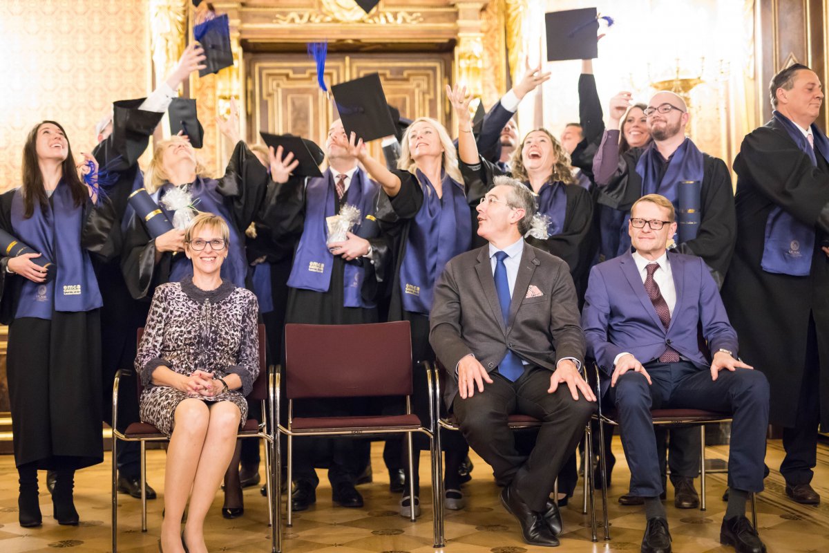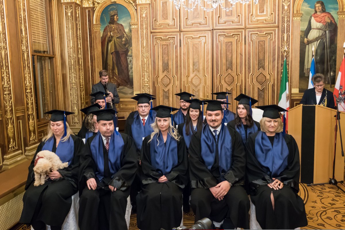 Überreicht wurden die Diplome durch einen hochrangigen Vertreter der Universität Católica San Antonio de Murcia (UCAM): Vizerektor für Internationale Beziehungen, Señor Pablo Salvador Blesa Aledo, Dekan der Fakultät Sozialwissenschaft und Kommuniation. Señor Blesa überbrachten die Glückwünsche der Universität und drückten den Absolventen und Absolventinnen ihre Hochachtung für deren Leistung als berufsbegleitend Studierende aus. Die Markgemeinde Leobersdorf war durch Gemeinderätin Margit Federle vertreten, die im Auftrag des Bürgermeisters jede Absolventin, jeden Absolventen zur Erinnerung an ihre Studienzeit mit einem traditionellen Keramikkrug mit Blaumalerei, eines in Leobersdorf wiederbelegten historischen Handwerks, beschenkte.